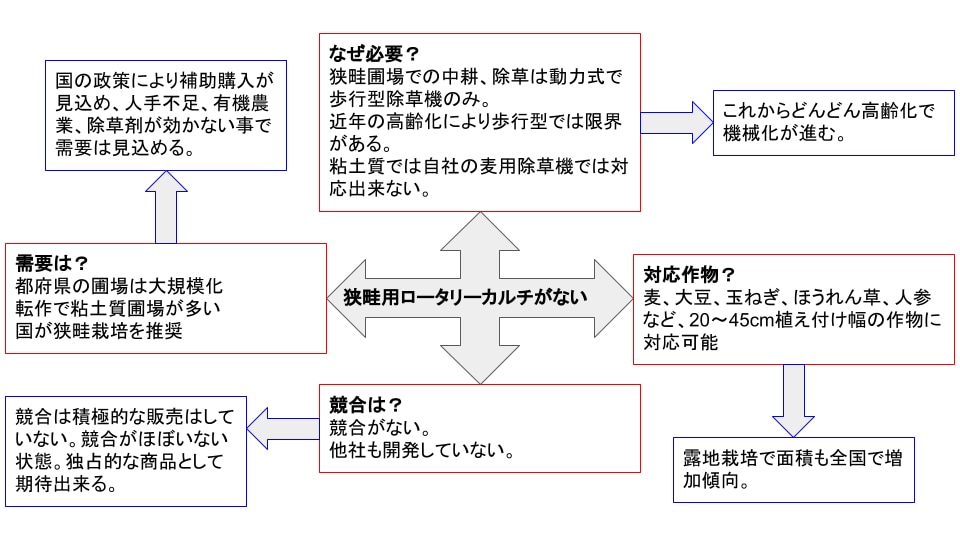 ロータリカルチであれば粘土質圃場でも、回転により砕く能力がある事と、雑草がある程度あっても強制的に除去可能な事から、いままで苦手だった圃場の土質と雑草をロータリーカルチで解消する思いで開発を行うことが決定しました。